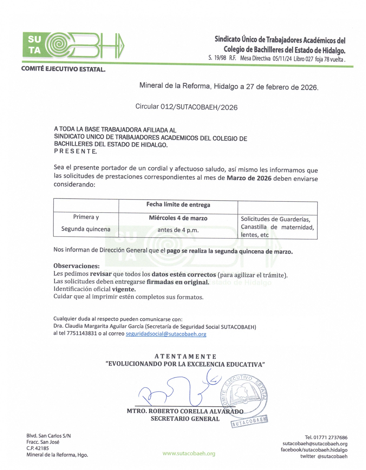 Circular # 12/2026 Prestaciones marzo